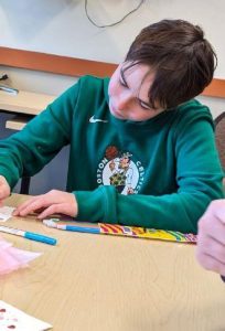 Each student made half a dozen cards with hearts, flowers, and other Valentine’s themed décor drawn on them along with a handwritten note on the back.