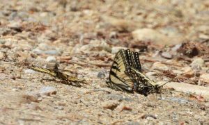 Tiger swallowtails and other butterfly species can often be seen in small to large groups near muddy little puddles on sand and gravel roads or even piles of animal dung. They do this in sunny areas, and a little research tells me they are after moisture, salts and other minerals that keep them thriving. In early April when my wife and I visited family on Lake Anna in Virginia, we saw puddling tiger swallowtails on the shoreline. This past week I saw a dozen or more doing the same on Coldbrook Road and Prison Camp Road. Like other insects that feed on nectar and pollen from flowers, they act as pollinators, which help our plants reproduce.